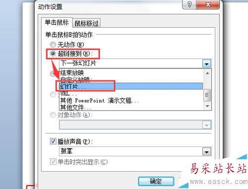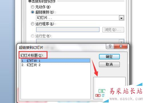 “超鏈接到”下面會有很多選項,能直接設定為跳轉到下一張幻燈片,也能跳到結束反映的位置,這里我們選擇“幻燈片...”就會出現所有這個PPT有的幻燈片,單擊即可在右下角查看是哪張了,選擇好了單擊那張幻燈片點【確定】。“鼠標移動時”默認就是無動作,不需要管它直接【確定】完成這一步的操作。