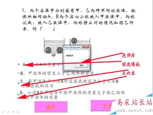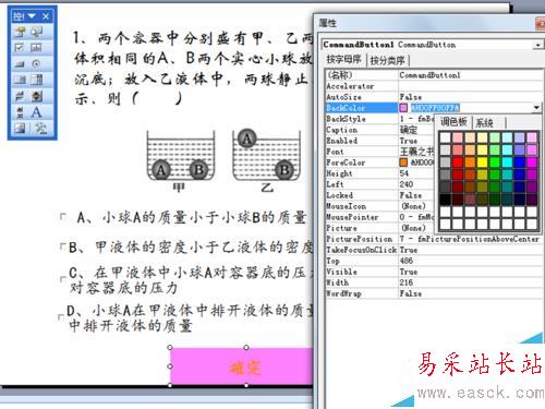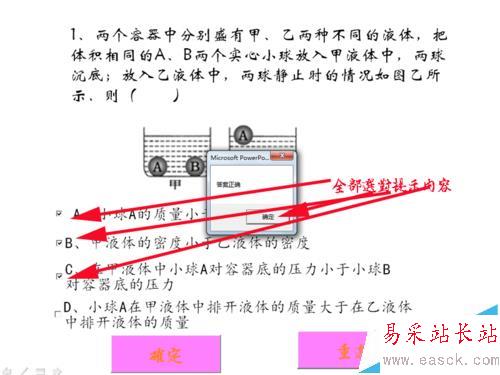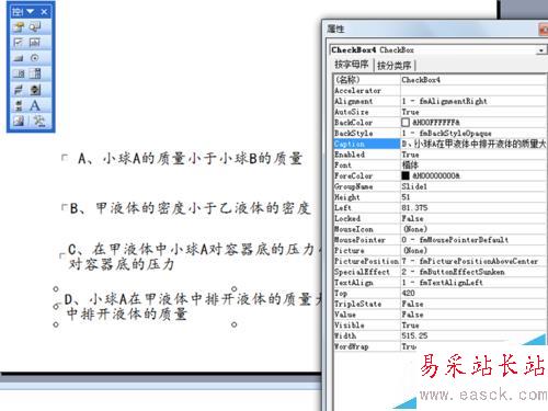 4、選擇復選框然后復制三個,并依次修改其caption的值為“ B. 甲液體的密度小于乙液體的密度”、“ C. 在甲液體中小球A對容器底的壓力小于小球B對容器底的壓力”、"D. 小球A在甲液體中排開液體的質量大于在乙液體中排開液體的質量"。并調節四個選項的位置使布局美觀。