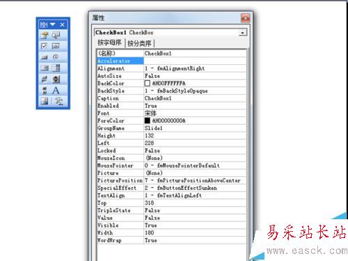2、在控件工具箱里選擇復選框,然后在編輯區域按住左鍵拖動拉出一個復選框checkbox1,右鍵單擊該復選框從下拉菜單中選擇屬性,調出屬性對話框。