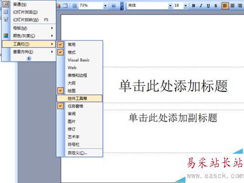 1、啟動ppt2003,執行視圖-工具欄-控件工具箱命令,調出控件工具箱,在主編輯區域你會看到該工具箱。