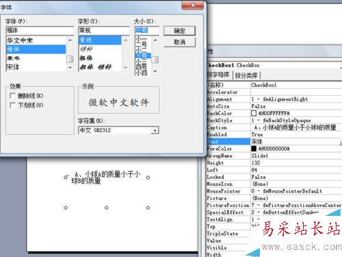 3、在屬性對話框中找到caption屬性修改其值為“ A、小球A的質量小于小球B的質量”,接著點擊font屬性修改字體為楷體,字形為常規,字號為三號,點擊確定按鈕,并設置auotsize為true。