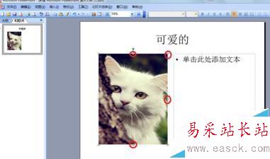 10、鼠標(biāo)點(diǎn)擊選中圖片,圖片上會出現(xiàn)8個空心圓,鼠標(biāo)拖動調(diào)整圖片大小,如圖所示