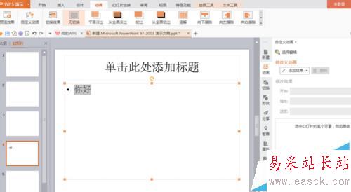 5、為你的幻燈片添加簡(jiǎn)單的動(dòng)畫(huà)特效。在最頂層找到動(dòng)畫(huà),點(diǎn)擊, 找到自定義動(dòng)畫(huà) 然后選中目標(biāo)添加動(dòng)畫(huà) ,注意要選中目標(biāo)。