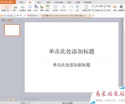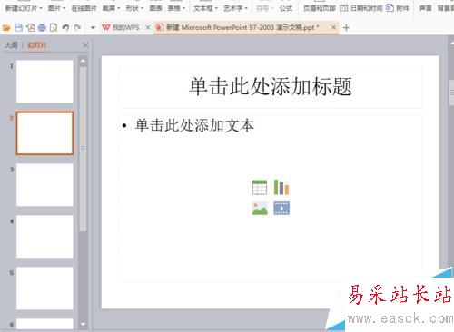2、添加一張幻燈片。在左上角找到新建幻燈片的按鈕,單擊一下添加一張幻燈片,注意不要點(diǎn)到它的倒三角形符號(hào)了。新建好了就是這個(gè)樣子的了。