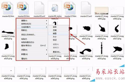 6、雙擊進入文件夾,在空白處單擊右鍵選擇【分組依據】,再選擇【類型】進行排列。這樣就可以方便的尋找自己需要的素材了。