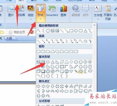 3、插入圖案。在導航欄上點擊插入,然后找到橢圓形的圖案,點擊這個圖案,就是要這個圖案來畫小狗的腳印。