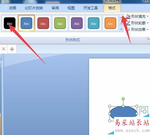 4、調整顏色。在空白幻燈片上畫出這個圖案,然后調整大小,雙擊圖案,對圖案進行調色,小編這里用的是黑色,大家可以自己調。