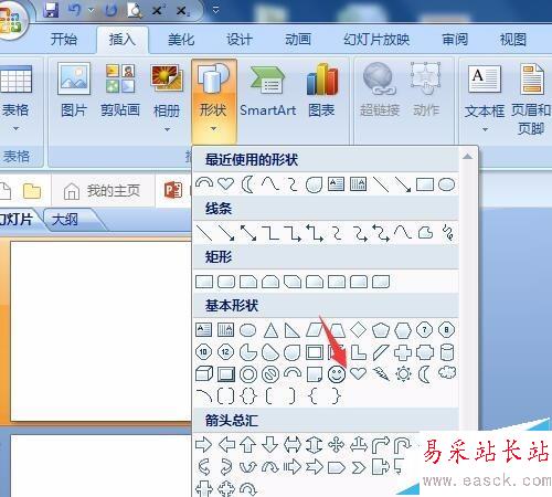 3、畫(huà)出心形圖案。點(diǎn)擊心形圖案后在空白的幻燈片上畫(huà)出來(lái),大小適宜即可。