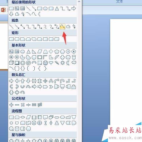 8、找曲線形狀。在插入——形狀中找到曲線的形狀,這個是畫單音符很重要的線條,記住要選擇曲線。