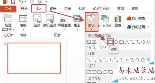 1、打開ppt。在主界面中點擊:“插入”→“形狀”→“矩形”,如圖所示