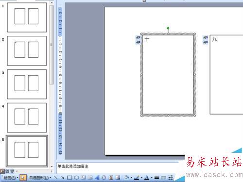 8、選擇第三張幻燈片中的兩個矩形,復制到第四張幻燈片中,選擇矩形六,點擊繪圖從下拉菜單中選擇疊放次序,接著選擇置于底層。同樣道理復制第二張幻燈片里的矩形4和3到第四張幻燈片中,修改矩形4置于底層。