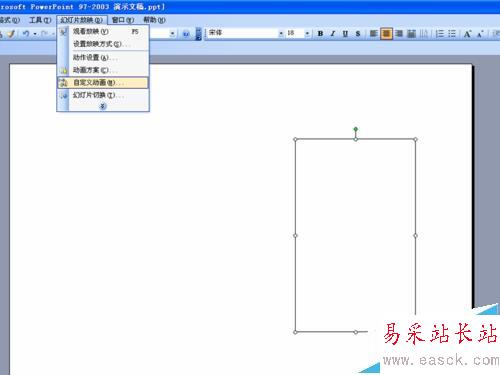 1、首先啟動powerpoint 2003,選擇左下角的矩形工具,在舞臺上繪制一個矩形,選擇該矩形,執行幻燈片放映-自定義動畫命令。