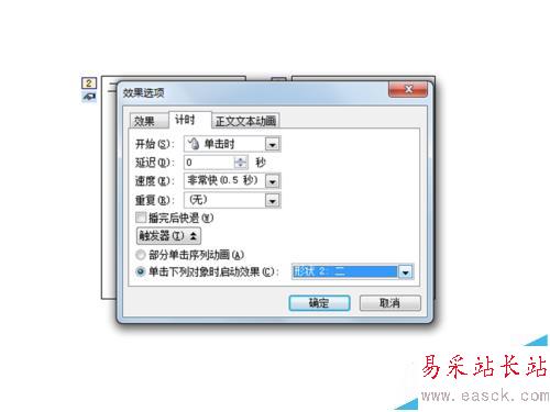 6、同樣方法設置第一個矩形的“出現”圖標和第二個矩形的退出圖標,點擊右下方下拉菜單,選擇計時,在彈出的對話框中選擇觸發器選中單擊下拉對象時啟動效果。