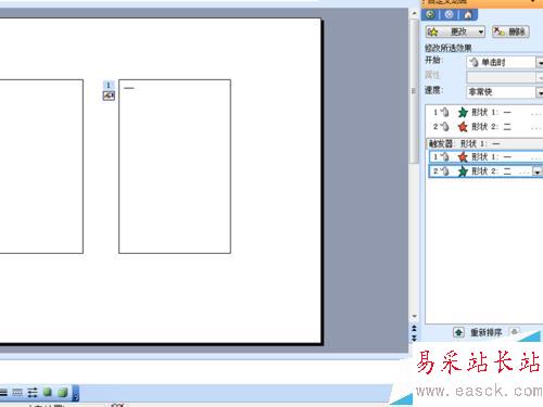 5、選擇第一個矩形的第一個動畫和第二個矩形的第四個動畫,點擊右下角的下拉菜單選擇計時,在彈出的對話框中點擊觸發器,選擇單擊下拉對象是啟動效果。