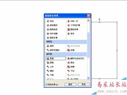 2、在右邊出現添加效果命令,點擊添加效果-退出-層疊命令,設置方向到左側,速度非???,再次選擇該矩形,執行添加效果-進入-伸展命令,設置方向為“自左側”,速度非??臁?/p>