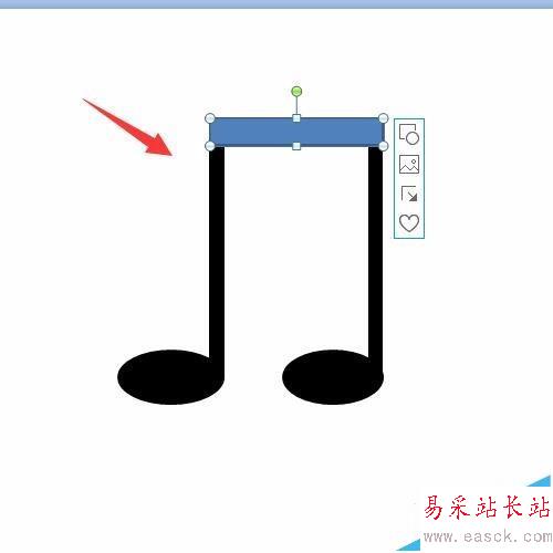 9、制作頂部矩形。如上面的步驟,點擊插入中的矩形,然后如圖所示調整矩形的大小和位置還有顏色,一個雙音符就做好了,不過還需要選中這些圖案然后右擊選擇組合,這樣一個簡單的雙音符才真正做好了。