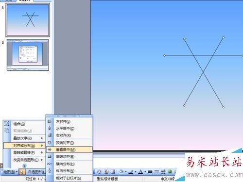 3、選擇三條直線,執行繪圖-對齊或分布-水平居中,接著再次設置垂直居中,再次執行繪圖-組合命令,將三條直線組合成一個圖形。