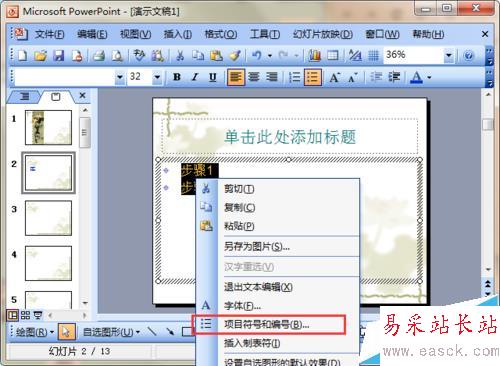 3、單擊“右鍵”,選中“項目符號和編號”;接著,會出來一個新的界面。