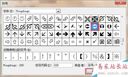 5、會出來一個符號界面;看到了吧,我們在符號中選中一個自己想要那個,就可以非常漂亮的設置符號了;如圖中所示,選中一個如圖所示的圖標;單擊確定;