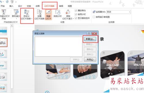 1、當然,如果你不想用這些系統設置的放映方式,也可以根據自己的需要創建自定義放映。有時候同一套演示文稿,因為放映對象的不同,我們就可以設置多套放映方案。下面就跟著我一起操作。找到“自定義幻燈片放映”,在彈出的自定義放映窗格中選擇新建,在這里就可以自定義我們自己的放映方案了。