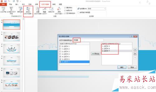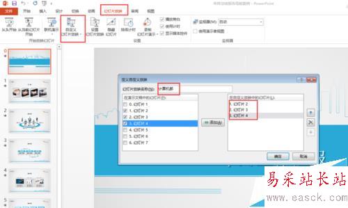 2、我們先修改下放映名稱,例如“計算機部”,然后在下面的列表中選擇幻燈片1、2、3,再點擊添加,如果添加錯了也沒關系,在窗格右側可以刪除幻燈片也可以調整播放順序。添加完成后點擊確定,這樣“計算機部”的放映就搞定了。