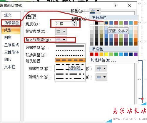 4、右鍵——設置形狀格式——線型,寬度2磅,短劃線類型選短劃線。線條顏色選深藍。