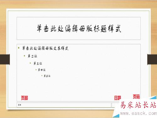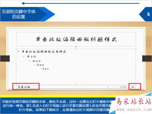 5、頁眉和頁腳中字體的設置。可能你覺得頁眉和頁腳的字體,顏色不合適,這時一定要在幻燈片模板中修改,就能對頁眉頁腳字體進行統(tǒng)一修改。