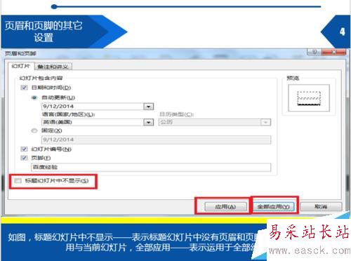 4、頁眉和頁腳的其它設置。如圖,標題幻燈片中不顯示——表示標題幻燈片中沒有頁眉和頁腳,應用——表示只應用與當前幻燈片,全部應用——表示運用于全部幻燈片。