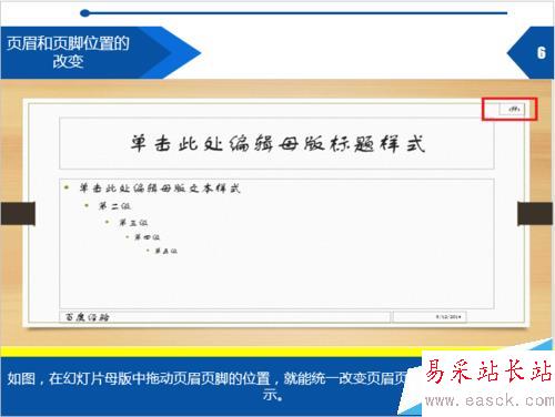 6、頁眉和頁腳位置的改變,如圖,在幻燈片母版中拖動頁眉頁腳的位置,就能統(tǒng)一改變頁眉頁腳的位置,效果如圖所示。