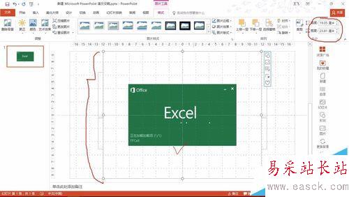 4、就會看到插入的圖片,并非為幻燈片的大小,雙擊圖片,會看到右上角顯示插入圖片的寬度和高度,如下圖所示:
