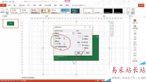 6、然后將我們記住的圖片的寬度和高度,填寫在幻燈片的寬度和高度的位置,一一對應(yīng),,如下圖所示: