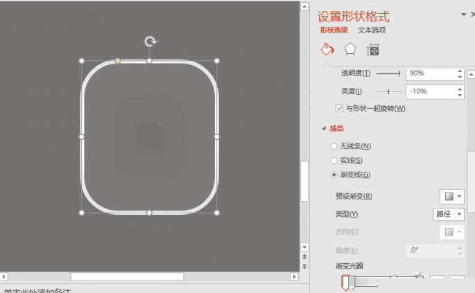 先制作水晶邊框。開啟一個空白幻燈片,設置其背景為“灰色—25%,背景2,深色50%”。插入一個圓角矩形(可拖動其黃色控制點來改變圓角的弧度),設置它的線條為“漸變線”,填充類型為“路徑”。