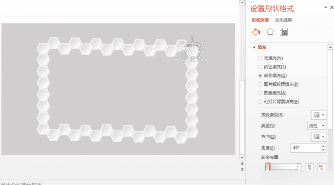 按住Shift鍵,插入一個“形狀”正六邊形。右擊這個正六邊形,選擇“設置形狀格式”,線條設置為“無線條”;填充設置為“漸變填充”,類型、方向等選默認,角度為45度,2個漸變光圈,光圈1顏色為“白色,背景1,深色15%”,光圈2顏色為“白色,背景1”。