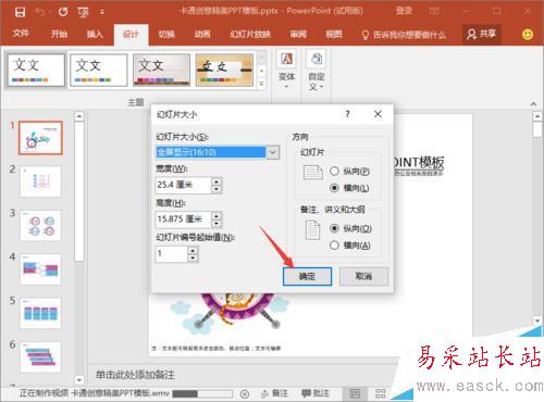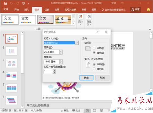 4、點(diǎn)擊“自定義幻燈片大小”按鈕后這個(gè)時(shí)候會(huì)打開(kāi)“幻燈片大小”對(duì)話窗口。如圖所示;