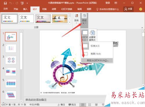 3、在“設(shè)計(jì)”選項(xiàng)卡中,依次點(diǎn)擊的“自定義”-->“自定義幻燈片大小”選項(xiàng)按鈕。如圖所示;