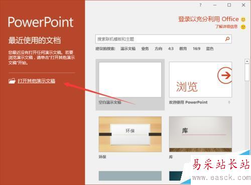 1、在計(jì)算機(jī)桌面上的PowerPoint2016程序圖標(biāo)雙擊鼠標(biāo)左鍵,將其打開(kāi)運(yùn)行。并點(diǎn)擊“空白文檔”選項(xiàng),新建一個(gè)空白ppt文檔。如圖所示;