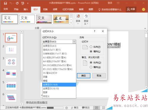 5、在“幻燈片大小”窗口中,點(diǎn)擊“全屏顯示”旁邊的下拉按鈕,在下拉列表菜單中,選擇“全屏顯示16:9或者16:10”兩個(gè)選項(xiàng)中的任意一個(gè)都可以。如圖所示;