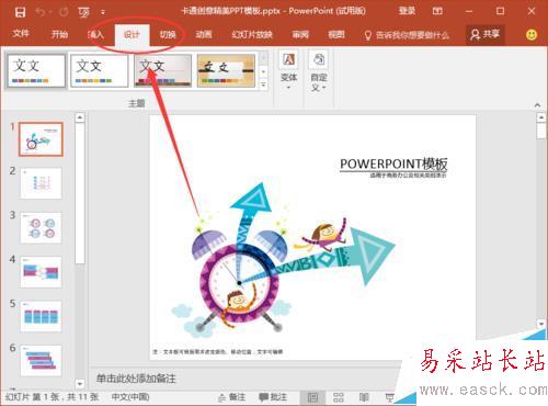 2、在打開(kāi)的ppt文檔窗口中,打開(kāi)菜單欄的“設(shè)計(jì)”選項(xiàng)卡。如圖所示;