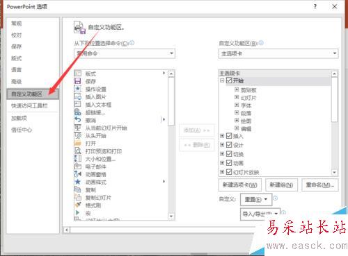 5、在“PowerPoint選項”對話窗口中,選擇左側的“自定義功能區”選項卡欄。如圖所示;