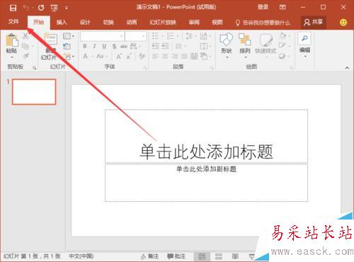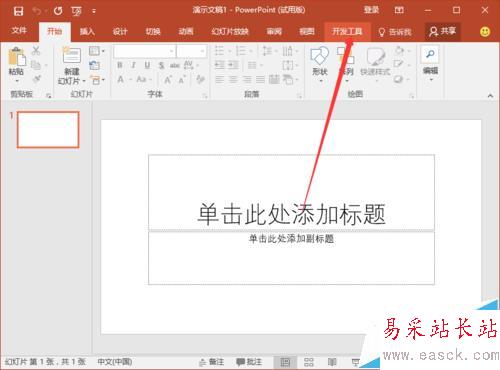 7、返回到我們的powerpoint演示文稿窗口中,我們可以看到標題菜單欄上已經添加上我們的“開發工具”選項卡了。如圖所示;