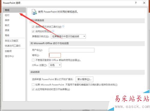 5、在“PowerPoint選項”對話窗口中,選擇左側的“常規”選項卡欄。如圖所示;