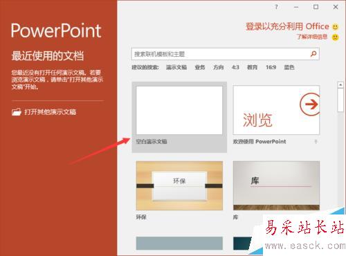 1、在計算機桌面上的PowerPoint2016程序圖標雙擊鼠標左鍵,將其打開運行。并點擊“空白文檔”選項,新建一個空白ppt文檔。如圖所示;