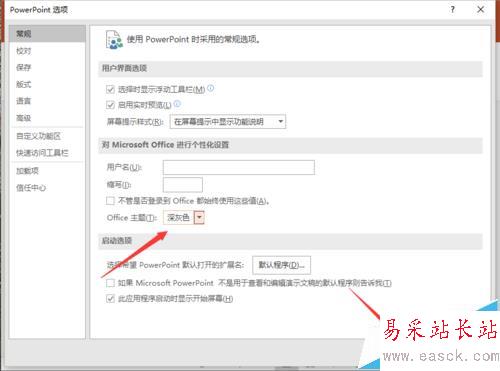 6、在“常規”選項右側窗格中,找到“對Microsoft Office進行個性化設置”中的“Office主題”并選擇“深灰色”,然后再點擊“確定”按鈕即可。如圖所示;
