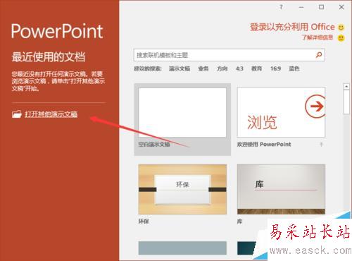 1、在計算機桌面上的PowerPoint2016程序圖標雙擊鼠標左鍵,將其打開運行。并點擊“打開其他演示文稿”選項,打開需要編輯的演示文稿文件。如圖所示;