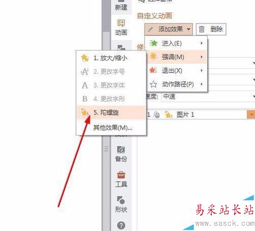 4、給車輪本身再次添加一個陀螺旋的動畫效果,在強調動畫效果對話框子菜單的第五個,如圖所示。
