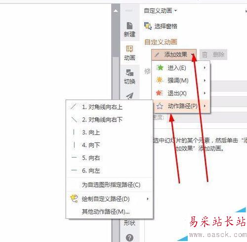 3、然后可是進行動畫效果的編輯,在動畫---自定義動畫設置一個直線移動的動畫效果,設置一下速度和時間。