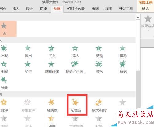 8、在”動畫“選項卡中選擇”陀螺旋“動畫。