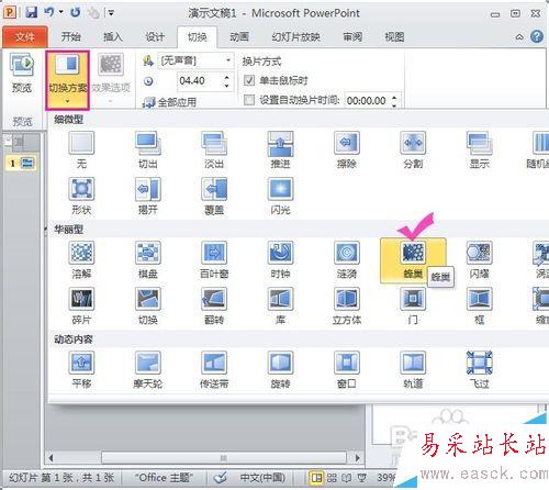 3、現(xiàn)在來設(shè)置如何讓我們的PPT背景動起來呢?先設(shè)置PPT原本的背景圖片有動畫效果,這里作為一張PPT背景圖片,需要對PPT設(shè)置“切換效果”,點擊菜單項“切換”的“切換方案”,選擇一個“切換方案”里面的“切換方案”,例如“蜂巢”: