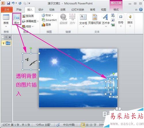 2、我制作的動態(tài)背景是要讓藍天大海的背景有船劃過還有海鳥飛過,讓PPT這張背景圖片活起來,插入海鳥跟船只的圖片,這里提醒最好插入的圖片為背景透明的圖片,讓與原PPT背景素材融合得更好哦,點擊“插入”的“圖片”插入ppt背景素材: