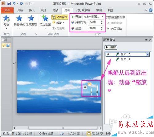 4、之前的切換效果只是讓PPT背景圖片出來,現(xiàn)在我們繼續(xù)設(shè)置其他PPT背景素材的動態(tài)出現(xiàn),例如,設(shè)置兩個帆船從遠到近劃過來,點擊帆船的圖片,然后點擊菜單項“動畫”(幻燈片自定義動畫)→“添加動畫”→“進入”的“縮放效果”,設(shè)置帆船動畫的開始時間為“與上一動畫同時”,持續(xù)時間為5秒,然后預(yù)覽下效果,是否效果從遠到近出現(xiàn)呢?